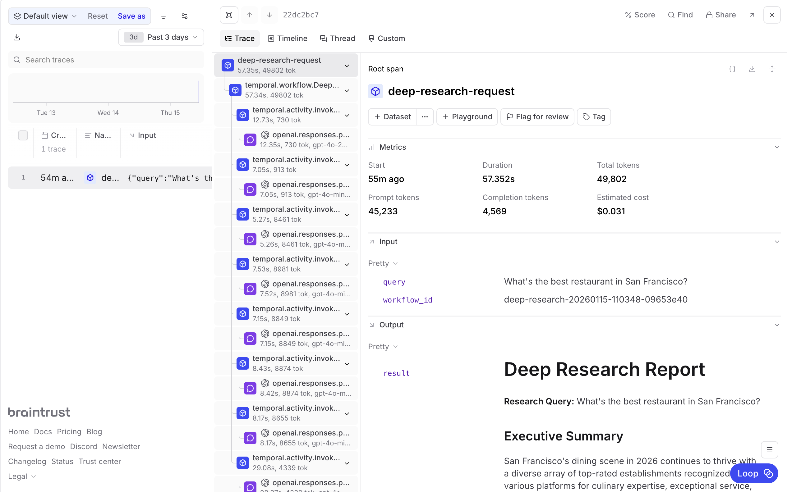 This workflow can take several minutes and involves dozens of API calls. Without Temporal, a failure at any point means starting over. Without Braintrust, you have no visibility into which agent made a bad decision or why.